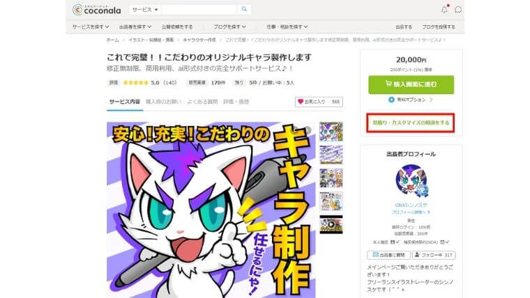 お気に入りのイラストレーターさんが見つかったら、「見積り・カスタマイズの相談」から自分のイメージを事前に相談してみましょう。